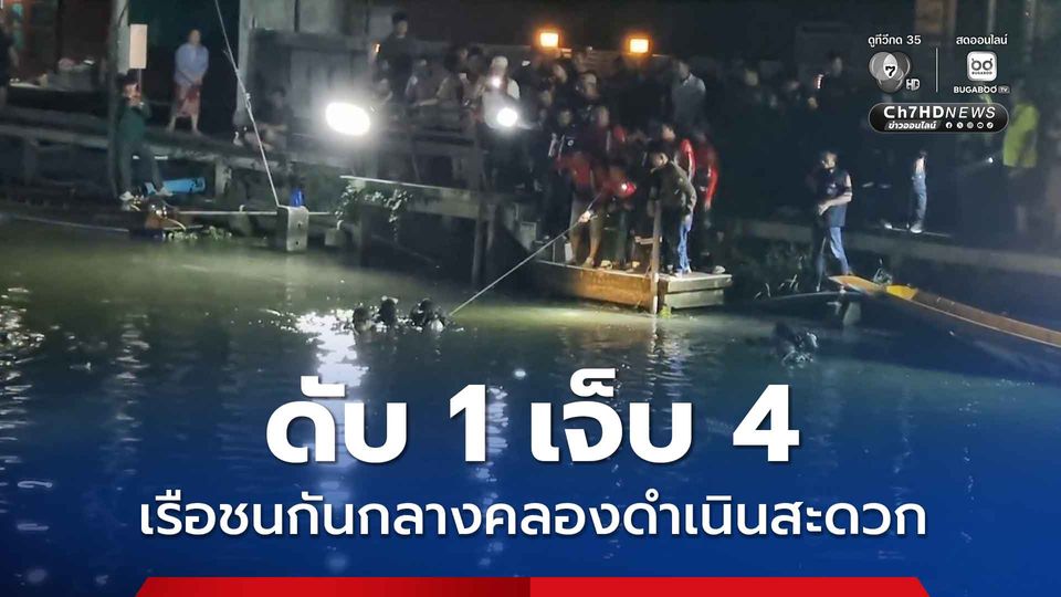 เกิดอุบัติเหตุเรือชนกันกลางคลองดำเนินสะดวก ทำให้มีผู้ได้รับบาดเจ็บ 4 คน และจมน้ำเสียชีวิต 1 คน เป็นเด็กชายอายุ 9 ขวบ