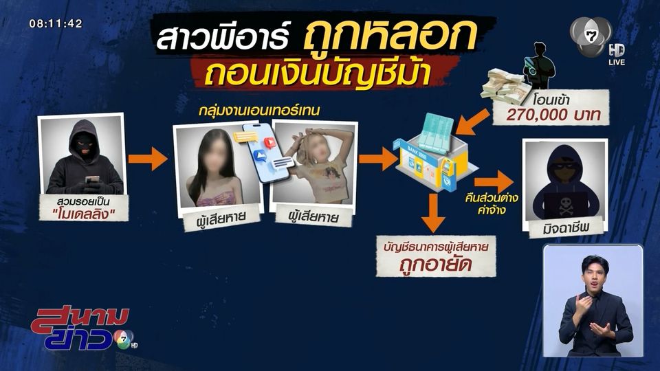 สนามข่าว 7 สี - แก๊งสแกมเมอร์ หลอกสารพัดที่จะหลอก ล่าสุดยังไปหลอกสาว "พีอาร์" ให้รับจ้างงานเอนเตอร์เทน แล้วรับโอนเงินจากบัญชีเพื่อน 270,000 บาท บอกฝากให้กดเอาส่วนต่างมาคืน สุดท้ายเจออายัดบัญชี ซ้ำต้องมาเสี่ยงรับใช้หนี้ที่ไม่ได้ก่อด้วย