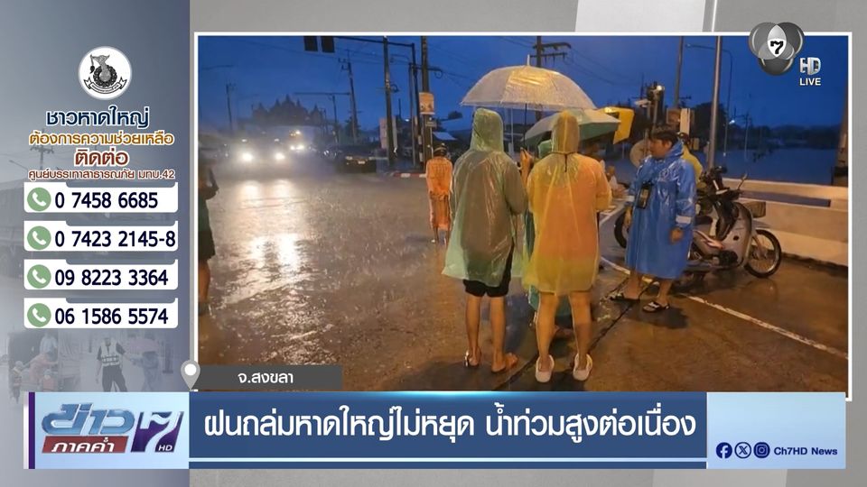 ข่าวภาคค่ำ - จนถึงขณะนี้ ฝนยังตกหนัก ถล่มเมืองหาดใหญ่ต่อเนื่อง เกิน 24 ชั่วโมงแล้ว ทำให้ระดับน้ำท่วมสูงหลายพื้นที่ ถนนแต่ละสายถูกตัดขาดจากกัน ขณะที่ชาวบ้านเร่งอพยพออกจากพื้นที่เสี่ยง
