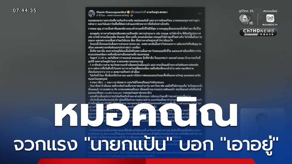 สนามข่าว 7 สี - หมอคณิณ โรงพยาบาลสงขลานครินทร์ โพสต์เศร้า "หาดใหญ่หนักกว่าที่เห็นในข่าว" ชี้ระบบเตือนภัยล้มเหลว น้ำสูงถึงชั้น 2 คนติดค้างทั่วเมือง เทศบาลกล้าพูดได้ไงว่า "เอาอยู่" ทั้งที่รู้ว่าหนัก เรียกว่า "ราบพณาสูญ"