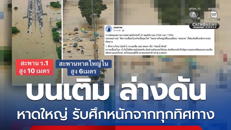 น้ำท่วมหาดใหญ่ วันนี้ (26 พ.ย.68) เพจหมอเจด นายแพทย์เจษฎ์ บุณยวงศ์วิโรจน์ อัปเดตจากข้อมูลสถานการณ์ล่าสุด วันที่ 26 พ.ย.68 เวลา 07:00น ทุกเหตุการณ์ มีความเชื่อมโยงกันเป็นลูกโซ่ โดยหาดใหญ่เปรียบเสมือน "คอขวด" ที่ต้องรับศึกหนักจากทุกทิศทาง ดังนี้