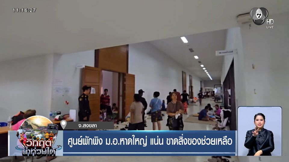 ห้องข่าวภาคเที่ยง - ศูนย์พักพิง ม.อ.วิทยาเขตหาดใหญ่ ตอนนี้มีผู้ประสบภัยเข้าไปพักอาศัยชั่วคราว ยอดล่าสุดทะลุ 6,000 คนแล้ว เรียกว่าเกินความจุ ทางมหาวิทยาลัยกำลังหาหนทางว่าจะทำอย่างไร แต่ที่แน่ ๆ ตอนนี้คือสิ่งของช่วยเหลือยังขาดแคลนอีกมาก