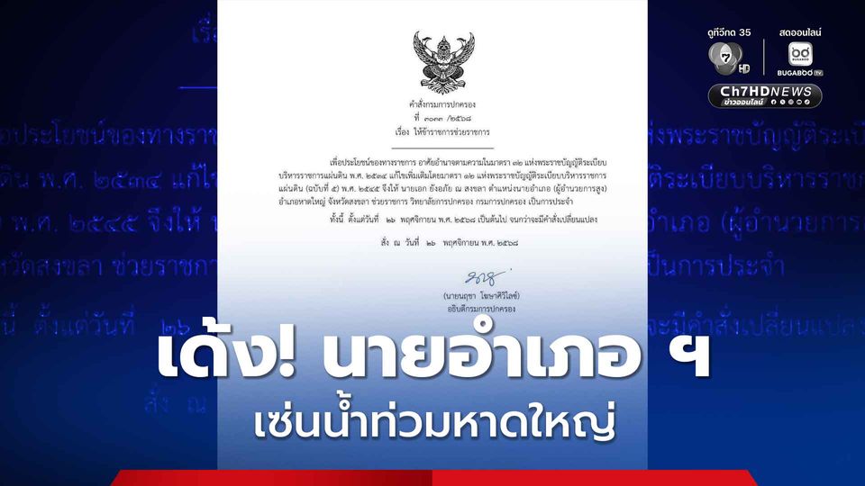 น้ำท่วมหาดใหญ่พ่นพิษ ล่าสุด (26 พ.ย.68) มีรายงานข่าวว่า นายนฤชา โฆษาศิวิไลซ์ อธิบดีกรมการปกครอง ลงนามคำสั่งกรมการปกครองที่ 3033 / 2568