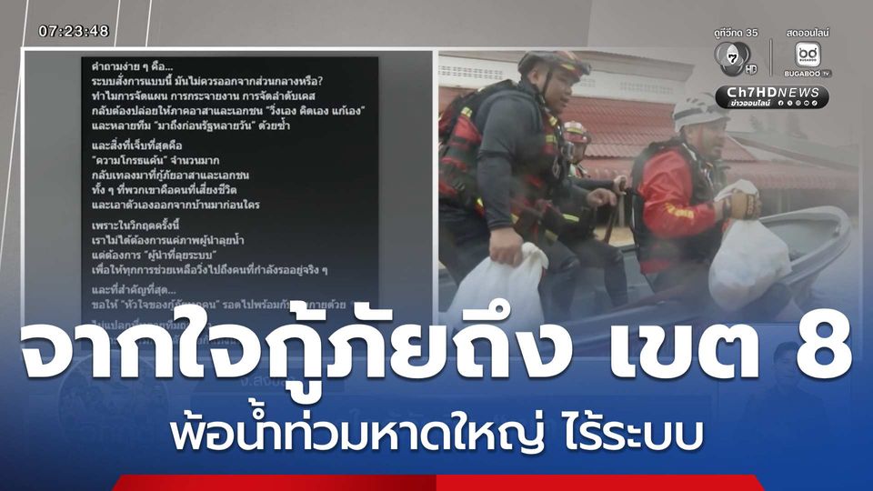 แต่ยอมลุยต่อไป กู้ภัยบางคนยอมไม่กินข้าว เพื่อจะได้พอเข้าไปให้คนที่รอ ขณะที่ไม่เห็น "ศูนย์บัญชาการหลัก" ประสบการณ์จากน้ำท่วมน่าน เชียงราย เชียงใหม่ กู้ภัยเข้าพื้นที่รู้ว่าต้องรายงานตัวกับใคร ลงทะเบียนเป็นระบบ
