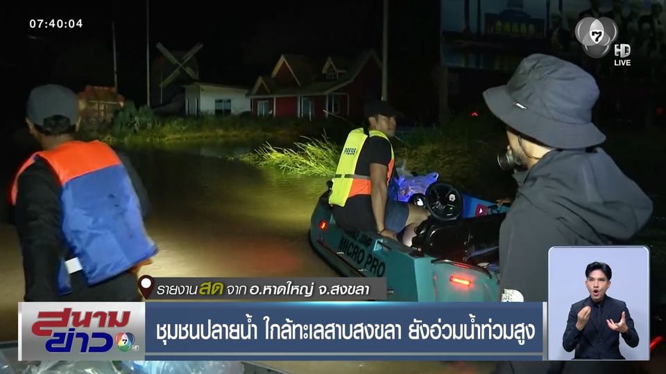 สนามข่าว 7 สี - แม้ว่าระดับน้ำในเขตเทศบาลนครหาดใหญ่ จะลดระดับลงต่อเนื่อง แต่พื้นที่ปลายน้ำ หลายชุมชนใกล้ทะเลสาบสงขลา ยังอ่วมหนัก เพราะมวลน้ำจำนวนมหาศาล เข้าท่วมพื้นที่น้ำยังสูง และท่วมนานกว่าเพราะเป็นปลายทาง จนชาวบ้านยังต้องอยู่ในบ้านที่ถูกน้ำท่วมสูง ติดตามจากคุณหนึ่ง อรรถพล ดวงจินดา รายงานสดจาก มัสยิดกลางจังหวัดสงขลา