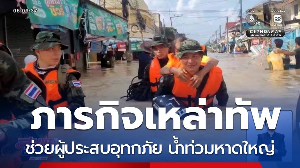 ในขณะที่ส่วนภาคพื้นดิน กองทัพบกเดินลุยน้ำท่วมสูง เพื่อนำผู้สูงอายุขี่หลังอพยพออกจากบ้าน ระหว่างการลุยน้ำ ก็ต้องล้อมหน้าล้อมหลัง ป้องกันไม่ให้ถูกกระแสน้ำพัด