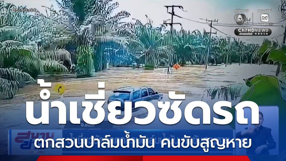 สนามข่าวเสาร์-อาทิตย์ - ที่จังหวัดตรัง พ่อค้าลอตเตอรี่ ถูกน้ำท่วมซัดรถตกสวนปาล์ม เจ้าหน้าที่ระดมค้นหากลางน้ำไหลเชี่ยว แต่ยังไร้ร่องรอย