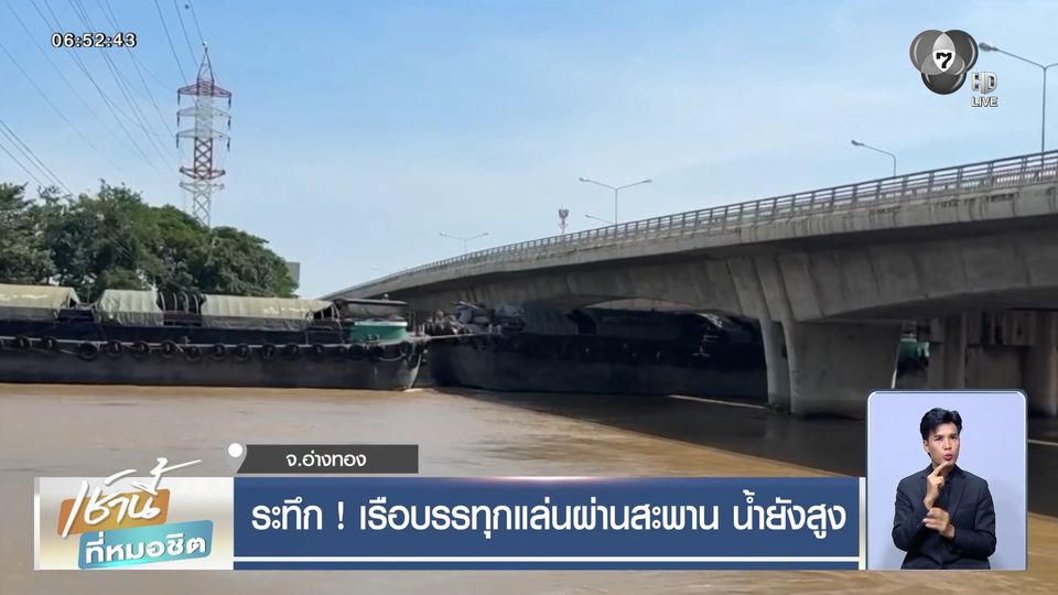 เรือบรรทุกสินค้าขนาดใหญ่แล่นทวนน้ำ มุ่งหน้าไปยังท่าเรือขนถ่ายสินค้า ในพื้นที่ อำเภอป่าโมก จังหวัดอ่างทอง ระดับน้ำยังสูง ระยะห่างของเรือกับใต้ท้องสะพานห่างกันเพียงเล็กน้อย คนขับเรือต้องใช้ความระมัดระวังและความชำนาญเป็นพิเศษในการกำหนดร่องน้ำเดินเรือลอดสะพาน แต่ก็สามารถผ่านไปได้อย่างปลอดภัย