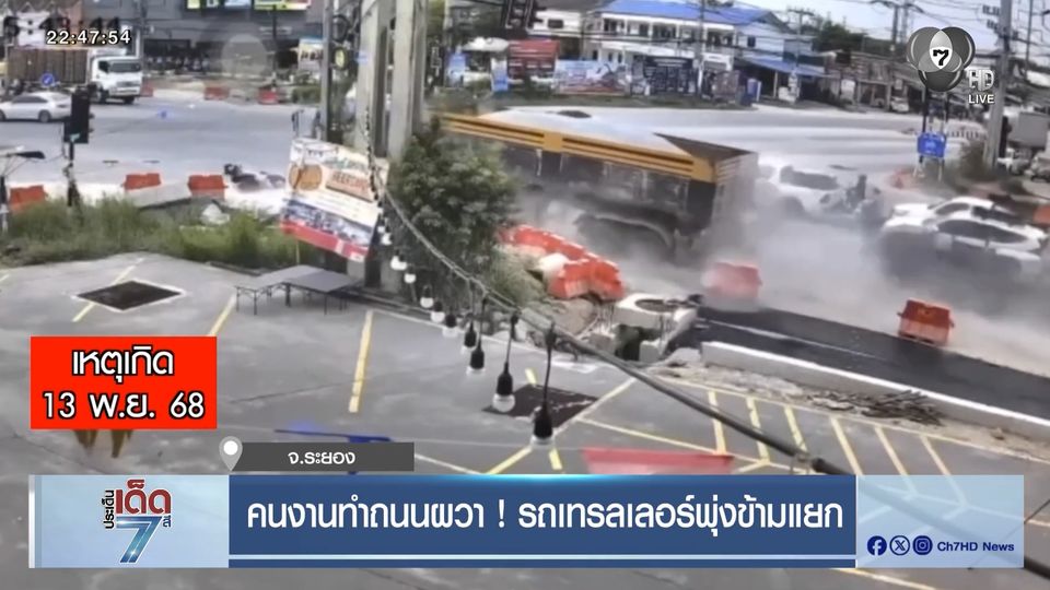 เหตุเกิดวันนี้เลย บริเวณสี่แยกลุงอุ้ย อำเภอปลวกแดง จังหวัดระยอง นี่คือแยกอันตราย กล้องวงจรปิดจับภาพรถเทรลเลอร์ 22 ล้อ พุ่งชนแบร์ริเออร์ทะลุเข้าไปจุดก่อสร้างถนน