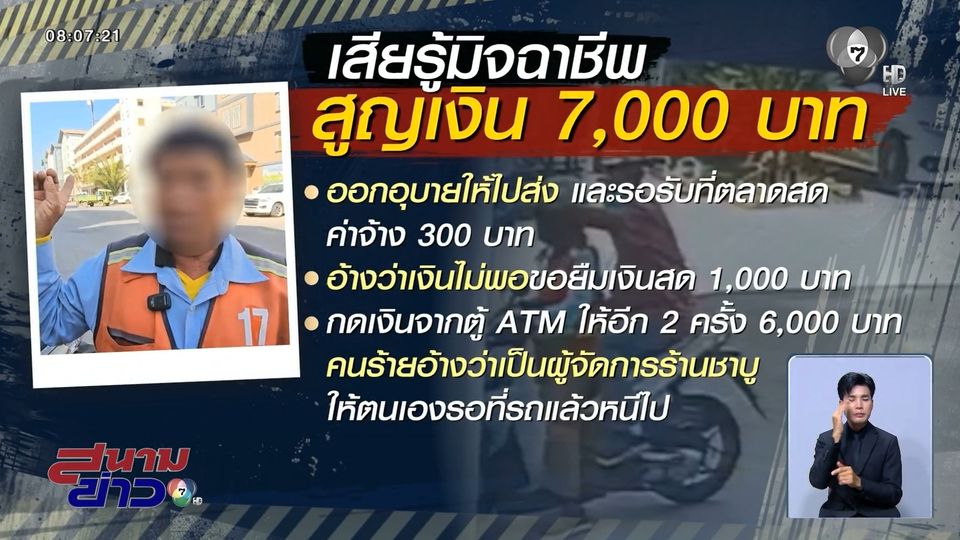 สนามข่าว 7 สี - มิจฉาชีพหลอกวันรถจักรยานยนต์รับจ้าง ให้ไปส่งตลาดไท ก่อนอ้างว่าจะเลี้ยงพระ และยืมเงินจ่ายก่อน สุดท้ายเชิดเงินหนี ได้เงินไป 7,000 บาท