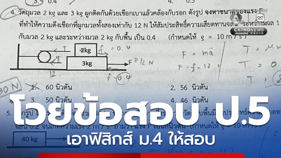 สนามข่าว 7 สี - กลายเป็นดรามาขึ้นมาทันที เมื่อข้อสอบวิทยาศาสตร์ ของนักเรียนชั้น ป.5 กลายเป็นเนื้อหาฟิสิกส์ของนักเรียนชั้น ม.4 จนเกิดคำถาม เป็นการวัดค่าความฉลาดของเด็ก หรือวัดว่า ครอบครัวไหนมีเงินส่งลูกเรียนพิเศษเนื้อหา ม.ปลาย ล่วงหน้าได้ไกลกว่ากัน !!