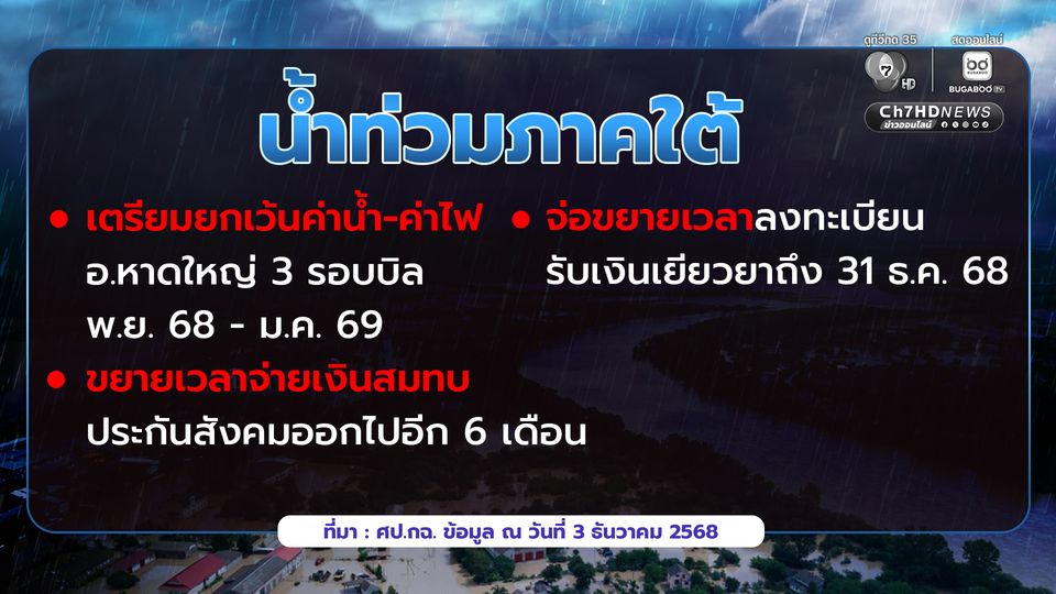 ทั้งนี้ ในการประชุมคณะรัฐมนตรีสัปดาห์หน้า การประปาส่วนภูมิภาค และ การไฟฟ้าส่วนภูมิภาค จะเสนอขอยกเว้นค่าน้ำ-ค่าไฟ ในพื้นที่ อ.หาดใหญ่เป็นเวลา 3 เดือน 3 รอบบิล คือ ในเดือน พ.ย.68 – ม.ค.69 ส่วนในบางพื้นที่อาจมีการยกเว้น 2 รอบบิล