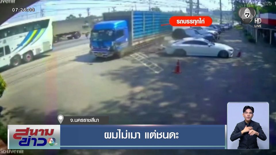 สนามข่าว 7 สี - หนุ่มขับรถบรรทุกไก่ขับชนท้ายรถทัวร์ แล้วเสียหลักไปชนคันอื่นอีก 2 คัน ทำให้คนขับรถทัวร์กับคนขับรถบรรทุกไก่ หวิดจะวางมวยกัน เพราะคนขับรถบรรทุกไก่ไม่พอใจ ที่ถูกคนขับรถทัวร์ถามว่า "คุณเมาไหม"