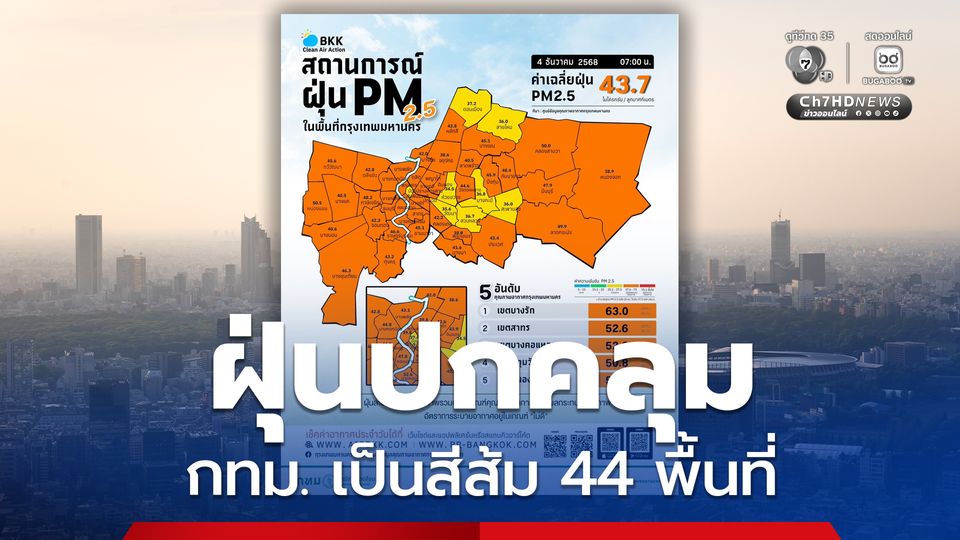 ศูนย์ข้อมูลคุณภาพอากาศกรุงเทพมหานครขอรายงานสถานการณ์ฝุ่นละอองขนาดไม่เกิน 2.5 ไมครอน (PM 2.5) ของสถานีตรวจวัดคุณภาพอากาศของกรุงเทพมหานคร ประจำวันที่ 4 ธ.ค.68 พบค่าฝุ่นเกินมาตรฐานอยู่ในระดับสีส้ม เริ่มมีผลกระทบต่อสุขภาพ (มาตรฐานไม่เกิน 37.5 มคก./ลบ.ม.) จำนวน 44 พื้นที่ คือ