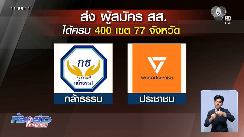 ห้องข่าวภาคเที่ยง - เจาะสนามเลือกตั้งวันนี้ แม้ว่าหลายพรรคเริ่มทยอยเปิดตัวว่าที่ผู้สมัคร สส. กันแล้ว แต่จากการตรวจสอบรายงานของ กกต. พบว่า มีเพียงแค่ พรรคกล้าธรรม กับ พรรคประชาชนเท่านั้น ที่สามารถ ส่งผู้สมัครได้ครบ 400 เขต 77 จังหวัด