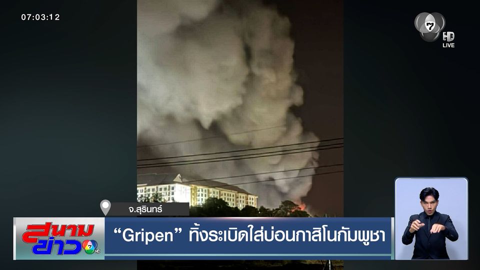 สนามข่าว 7 สี - ย่างเข้าสู่วันที่ 4 แล้วของการปะทะตามแนวชายแดนไทย-กัมพูชา ตั้งแต่เมื่อวานนี้ จนถึงช่วงค่ำที่ผ่านมา ยังคงมีเสียงปืน เสียงระเบิดดังต่อเนื่อง และช่วงเวลาประมาณ 20.00 น. ทางกองทัพอากาศไทย ส่งเครื่องบินรบ Gripen ทิ้งระเบิดแรงสูงใส่บ่อนกาสิโนของกัมพูชา