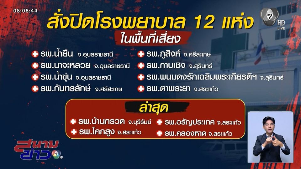 สนามข่าว 7 สี - ผลพวงจากเหตุปะทะตลอดชายแดนทั้งในจังหวัดภาคอีสานใต้ เรื่อยมาถึงจังหวัดภาคตะวันออก กระทบโรงพยาบาลหลายแห่ง ต้องปิดให้บริการชั่วคราว และสถานศึกษากว่า 1,000 แห่งใน 7 จังหวัดพื้นที่เสี่ยงชายแดนไทย-กัมพูชา