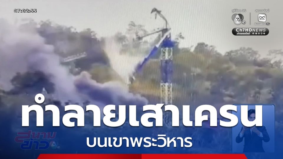 สนามข่าว 7 สี - สถานการณ์ชายแดนจังหวัดศรีสะเกษ โดยเฉพาะพื้นที่เขาพระวิหาร มีการปะทะกันอย่างดุเดือด โดยไทยได้ทำลายเสาเครนขนาดใหญ่ที่ตั้งอยู่บนเขาพระวิหาร