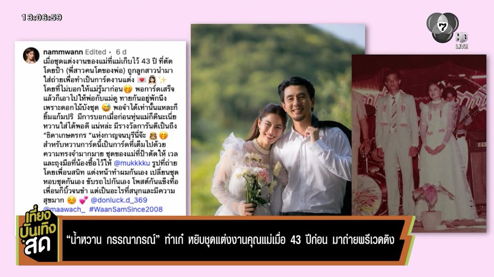 ซึ่งแคปชัน น้ำหวาน ก็น่ารักมาก ๆ บอกว่า "ชุดนี้เป็นชุดของแม่ที่ตัดโดยป้า ถูกลูกสาวนำมาใส่ถ่ายภาพทำการ์ด โดยไม่บอกให้แม่รู้มาก่อน การ์ดเสร็จแล้วก็เอาไปให้พ่อกับแม่ดู พอจำได้เท่านั้นแหละ..... ยิ้มแก้มปริ"