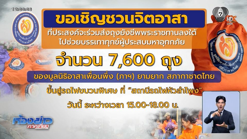ห้องข่าวภาคเที่ยง - ขอรับความช่วยเหลือจากพลเมืองจิตอาสา ที่ประสงค์จะมีส่วนร่วมในการส่งถุงยังชีพพระราชทานลงใต้ไปช่วยบรรเทาทุกข์ผู้ประสบมหาอุทกภัย