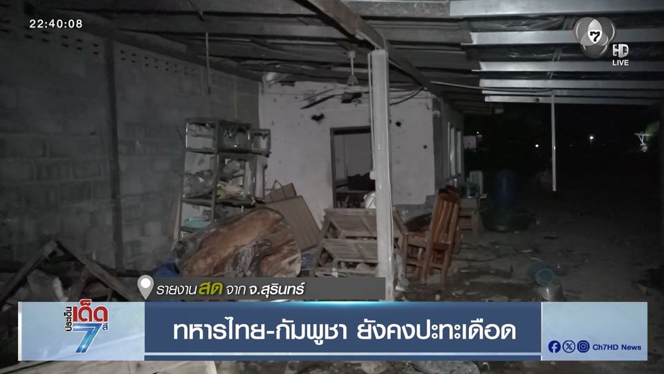 ประเด็นเด็ด 7 สี - ส่วนสถานการณ์ล่าสุดที่ จังหวัดสุรินทร์ ยังมีเสียงปืนดังขึ้นต่อเนื่อง วันนี้มีระเบิดตกใส่บ้านเรือนชาวบ้านถึง 3 หลัง จะเสียหายขนาดไหน ไปติดตามรายงานสดกับคุณเกียรติชัย บุญราโส ในเจาะเกาะติด