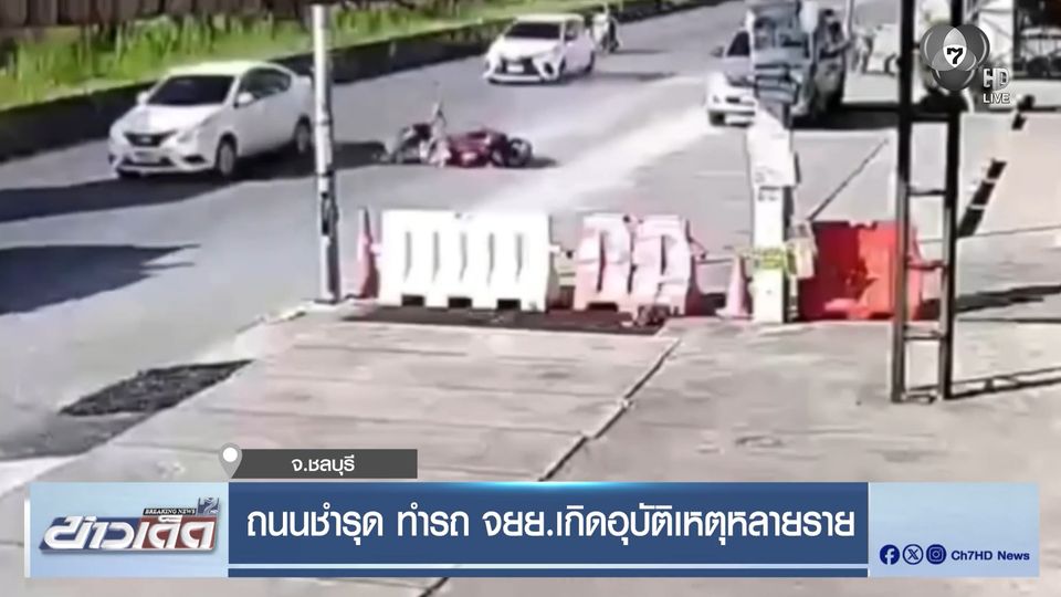 สภาพผิวการจราจร บนถนนเลียบทางรถไฟเขาน้อย พื้นที่ตำบลหนองปรือ อำเภอบางละมุง จังหวัดชลบุรี ซึ่งมีทั้งเป็นลอนคลื่น และเป็นหลุมเป็นบ่อ ทำให้ทั้งรถจักรยานยนต์ รถสามล้อพ่วงข้าง เกิดเสียหลักล้มกลิ้งกลางถนน และเสียหลักพุ่งเข้าชนกับบ้านเรือนประชาชนที่อยู่ริมทาง จนคนขี่-คนซ้อนท้ายบาดเจ็บไปตาม ๆ กัน
