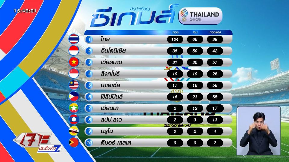 สรุปเหรียญทองล่าสุด ไทย ทะลุ 100 เหรียญไปแล้ว ได้ 104 เหรียญทอง อันดับที่ 2 อินโดนีเซีย 35 เหรียญทอง และอันดับที่ 3 เวียดนาม 31 เหรียญทอง