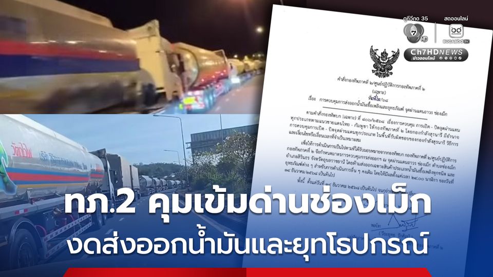 ศปก.ทภ.2 คุมเข้มด่านช่องเม็ก งดส่งออกน้ำมันและยุทโธปกรณ์ มีผลเที่ยงคืน 14 ธ.ค. 68 พบมีรถบรรทุกน้ำมันจอดรอหน้าด่านกว่า 80 คัน จำนวน 4 ล้านลิตร ถ้าปล่อยผ่าน อาจถูกส่งไปถึงกัมพูชา