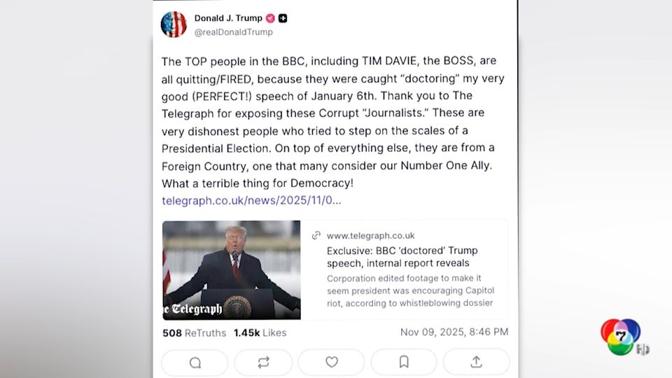 วานนี้ (15 ธ.ค.) ประธานาธิบดี โดนัลด์ ทรัมป์ แห่งสหรัฐฯ ยื่นฟ้องสำนักข่าวบีบีซี (BBC) ของอังกฤษแล้ว ในข้อหาหมิ่นประมาท ทำให้เสียชื่อเสียง พร้อมเรียกเงินค่าเสียหายถึง 5,000 ล้านเหรียญสหรัฐฯ หรือประมาณ 157,000 ล้านบาท จากกรณีที่รายการสารคดี "พาโนรามา" ของบีบีซี ตัดต่อคลิปคำพูดของทรัมป์ จนทำให้ดูเหมือนว่าเขาสั่งการให้ผู้สนับสนุนใช้ความรุนแรงในการบุกอาคารรัฐสภาสหรัฐฯ เพื่อล้มผลการเลือกตั้งประธานาธิบดีสหรัฐฯ เมื่อเดือนมกราคมปี 2564