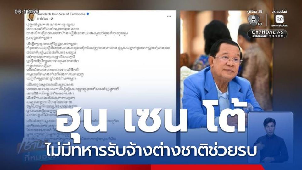 สมเด็จฯ "ฮุน เซน" โพสต์ข้อความบนเฟซบุ๊กฯ เป็นภาษากัมพูชา ซึ่งแปลไทยได้ความว่าช่วงไม่กี่วันก่อน สื่อฯ ไทยบางสำนักรายงานข่าวว่า มีทหารชาวรัสเซีย และชาวต่างชาติบางส่วน เข้าร่วมปฏิบัติการสู้รบกับกองทัพกัมพูชา เพื่อรักษาเกียรติ และศักดิ์ศรีของกัมพูชา รวมถึงรัสเซีย และชาวต่างชาติอื่น ๆ ที่ถูกกล่าวหา ยืนยันว่า กัมพูชา ไม่มีพลเมืองชาวรัสเซีย หรือชาวต่างชาติอื่น ๆ เข้าร่วมในการสู้รบในสนามรบ หรือทำหน้าที่ เป็นที่ปรึกษาทางทหารให้กับกองทัพกัมพูชา และไม่มีกองทัพต่างชาติ ประจำการอยู่บนแผ่นดินกัมพูชา นับตั้งแต่กองกำลังรักษาสันติภาพ ถอนตัวออกไปเมื่อ 32 ปีที่แล้ว ช่วง ค.ศ.1993 ซึ่งตรงกับ พ.ศ 2536