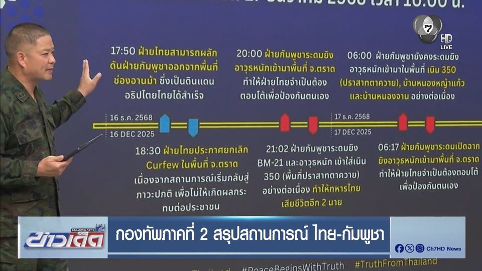 ข่าวเด็ด 7 สี - เพจฯ กองทัพภาคที่ 2 สรุปสถานการณ์การรบปะทะตามแนวชายแดนไทย-กัมพูชา ยังมีการยิงปะทะในบางพื้นที่