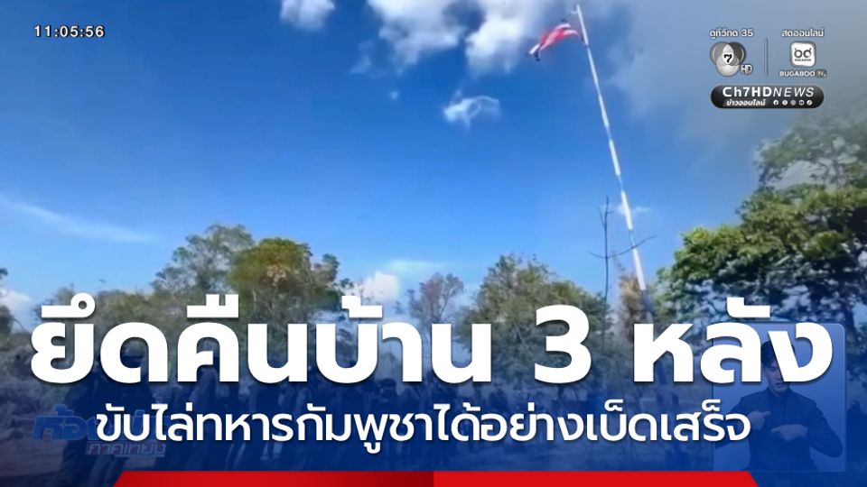 ห้องข่าวภาคเที่ยง - ทหารหน่วยเฉพาะกิจนาวิกโยธินตราด เปิดภาพยึดคืนพื้นที่บ้าน 3 หลัง ขับไล่ทหารกัมพูชาได้อย่างเบ็ดเสร็จ พร้อมเชิญธงชาติไทย ธงราชนาวีขึ้นสู่ยอดเสา