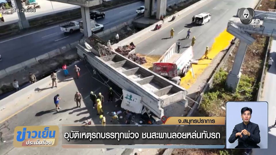 ข่าวเย็นประเด็นร้อน - อุบัติเหตุสะพานลอยหล่นทับรถ ช่วงถนนบางนา กิโลเมตรที่ 34 ในจังหวัดสมุทรปราการ มีทั้งผู้บาดเจ็บ และเสียชีวิต