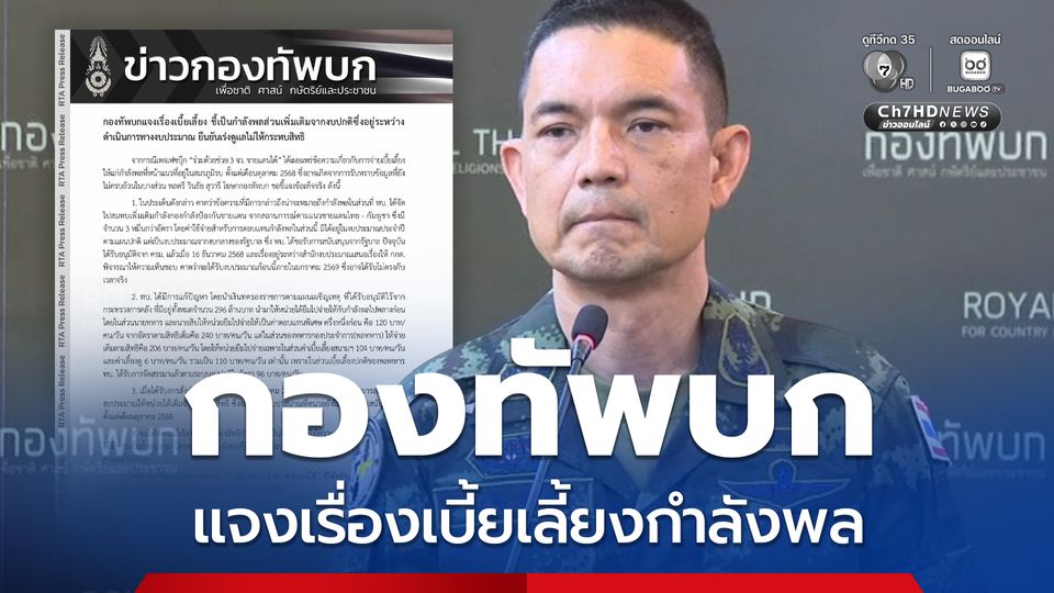 จากกรณีเพจเฟซบุ๊ก “ร่วมด้วยช่วย 3 จว. ชายแดนใต้” ได้เผยแพร่ข้อความเกี่ยวกับการจ่ายเบี้ยเลี้ยงให้แก่กำลังพลที่หน้าแนวที่อยู่ในสมรภูมิรบ ตั้งแต่เดือนตุลาคม 2568 ซึ่งอาจเกิดจากการรับทราบข้อมูลที่ยังไม่ครบถ้วนในบางส่วน พลตรี วินธัย สุวารี โฆษกกองทัพบก ขอชี้แจงข้อเท็จจริง ดังนี้