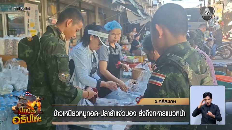 แม่ค้าตลาดสดอำเภอกันทรลักษ์ จังหวัดศรีสะเกษ ทุกเช้านัดรวมกลุ่มกัน ทำเสบียงอาหารให้กับทหารแนวหน้า อย่างวันนี้ ห่อข้าวเหนียวหมูทอดกับปลาร้าแจ่วบอง พร้อมน้ำดื่มและอาหารแห้ง มอบให้ทหารที่ลงมาจากฐานแนวชายแดน ที่ต้องการซื้อเสบียงกลับไปปฏิบัติหน้าที่ทุกเช้า