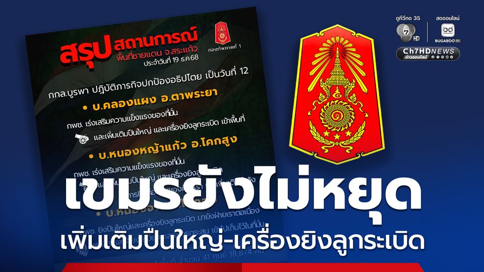 วันที่ 12 ของการสู้รบ ชายแดนสระแก้ว เขมรยังไม่หยุด เพิ่มเติมปืนใหญ่-เครื่องยิงลูกระเบิด ยิงเข้าในพื้นที่ฝั่งไทยอย่างต่อเนื่อง ลำเลียงเสบียง อาวุธ กระสุน เข้าไปเก็บไว้ในที่มั่นต่าง ๆ คาดจะอยู่ในที่มั่นดัดแปลงได้ 2-3 วัน