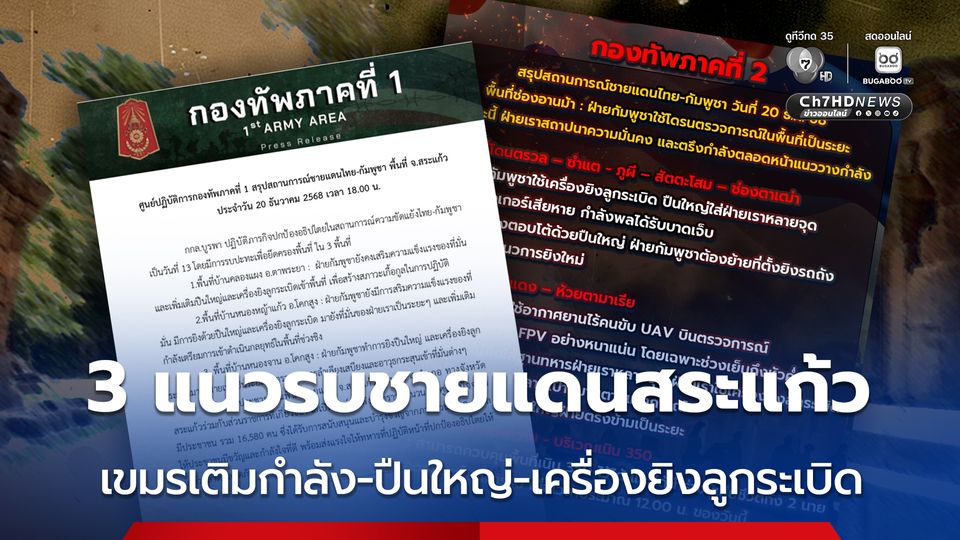 กองทัพภาคที่ 1 สรุปสถานการณ์ชายแดนไทย-กัมพูชา พื้นที่ จ.สระแก้ว พื้นที่ 3 แนวรบ พบกัมพูชาเสริมความแข็งแรงของที่มั่น เพิ่มเติมปืนใหญ่และเครื่องยิงลูกระเบิดเข้าพื้นที่ เตรียมการเข้าดำเนินกลยุทธ์ในพื้นที่ช่วงชิง