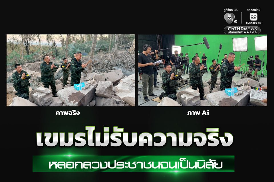 ปรากฎภาพสื่อกัมพูชาได้ใช้ AI สร้างเฟกนิวส์ กล่าวหาไทยไม่ได้ ยึดคืนพื้นที่ปราสาทตาควายและเนิน 350 โดยภาพ พล.ท.บุญสิน เป็นการถ่ายทำในสตูดิโอ โดยมีชาวกัมพูชาเข้ามาคอมเมนต์ขอบคุณที่ช่วยตีแผ่ความจริง พร้อมระบุว่า คนไทย ถูกรัฐบาลตัวเอง และทหารไทยหลอกซ้ำแล้วซ้ำเล่า จากนั้นก็ช่วยกันแชร์เนื้อหาดังกล่าวในโซเชียลมีเดีย