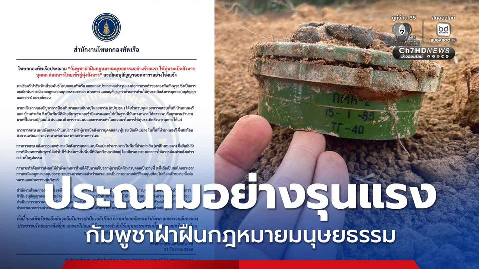 โฆษกกองทัพเรือประณาม “กัมพูชาฝ่าฝืนกฎหมายมนุษยธรรมอย่างร้ายแรง ใช้ทุ่นระเบิดสังหารบุคคล ล่อทหารไทยเข้าสู่ทุ่งสังหาร” ละเมิดอนุสัญญาออตตาวาอย่างโจ่งแจ้ง
