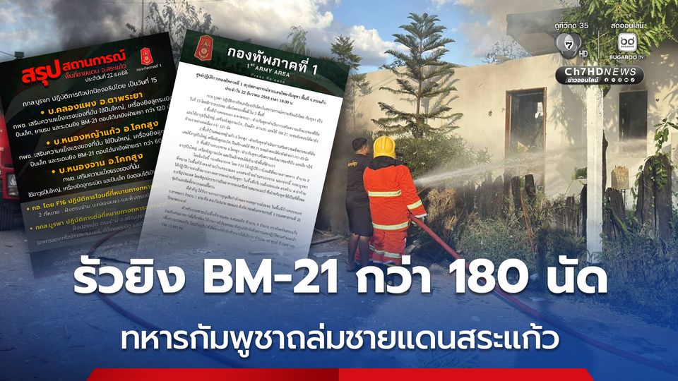 สถานการณ์ชายแดนสระแก้วยังเดือด พบทหารกัมพูชารัวยิงจรวดหลายลำกล้อง BM-21 ใส่พื้นที่บ้านคลองแผง-บ้านหนองหญ้าแก้ว กว่า 180 นัด ตกใส่บ้านเรือนประชาชน