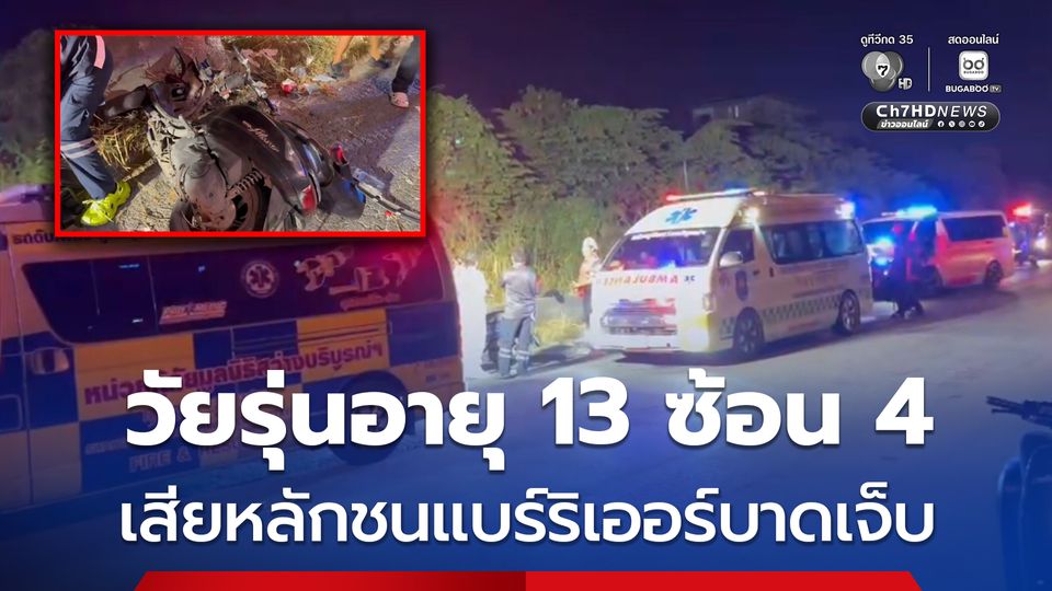 เด็กชายวัย 13 ขี่รถ จยย.ซ้อน 4 เสียหลักชนแบร์ริเออร์ รถพังยับ ได้รับบาดเจ็บทั้ง 4 คน