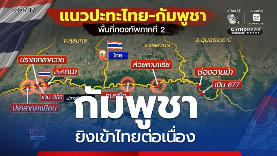 ประเด็นเด็ด 7 สี - ยังเปิดปะทะกันตลอดทั้งวัน จากกัมพูชายิงอาวุธหนัก ไปพื้นที่ประชาชนกว่า 51 แห่งจังหวัดสระแก้ว มีชาวบ้านบาดเจ็บ ไร่สวนเรือกนาเสียหาย ไม่เว้นแต่สัตว์เลี้ยง ก่อนที่จะมีการประชุม GBC วันพรุ่งนี้ ที่จันทบุรี