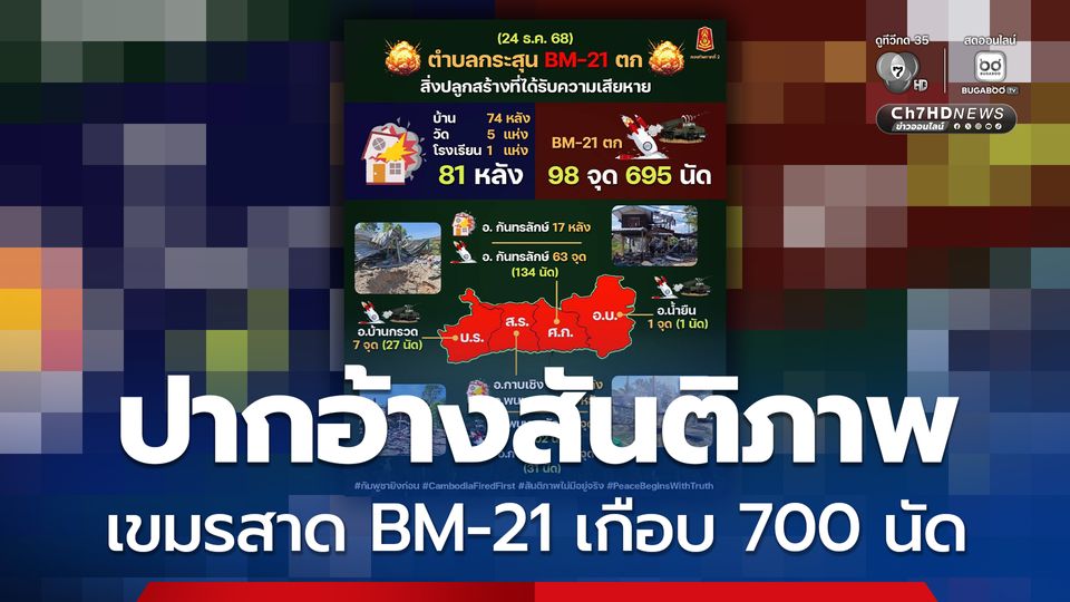 วันนี้ (24 ธ.ค.68) กองทัพภาคที่ 2 รายงานพื้นที่ชุมชนที่ได้รับความเสียหายจากการกระทำของฝ่ายทหารกัมพูชาที่ยิงจรวดหลายลำกล้อง BM-21 ใส่เป้าหมายเป็นบ้านเรือนประชาชน โดยมีกระสุน BM-21 ตกใส่พื้นที่ 98 จุด รวม 695 นัด ในจำนวนนี้ ลงที่ อ.พนมดงรัก มากถึง 502 นัด รวม 44 จุด บ้านเรือนเสียหาย 12 หลัง รองลงมาเป็น อ.กันทรลักษ์ 134 นัด รวม 63 จุด บ้านเรือนเสียหาย 17 หลัง