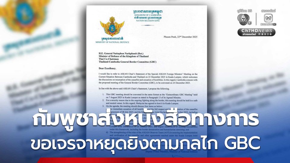 กัมพูชาส่งหนังสือทางการขอเจรจาหยุดยิงตามกลไก GBC ไทยย้ำต้องพิสูจน์ความจริงใจตาม 3 เงื่อนไขหลัก ด้านรองเสนาธิการทหาร เผย บรรยากาศและท่าทีของฝ่ายกัมพูชาหลังการหารือเป็นไปในทิศทางที่ดี