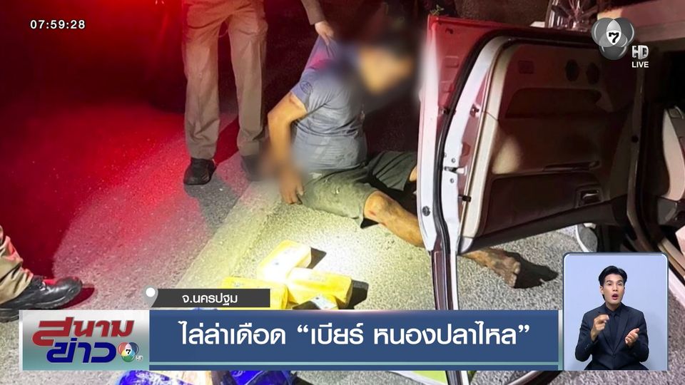 สนามข่าว 7 สี - ตำรวจ สภ.บางเลน ไล่ล่าจับกุม "เบียร์ หนองปลาไหล" ผู้ต้องหาค้ายาบ้ารายใหญ่ เป็นระยะทางกว่า 30 กิโลเมตร ก่อนที่รถของ "เบียร์ หนองปลาไหล" จะประสบอุบัติเหตุ ทำให้จับกุมตัวได้