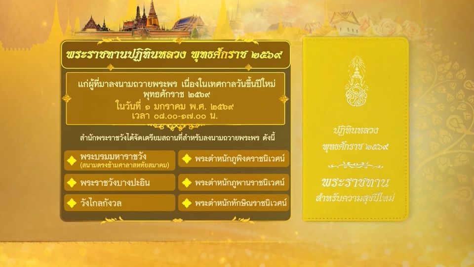พระบาทสมเด็จพระเจ้าอยู่หัว และสมเด็จพระนางเจ้า ฯ พระบรมราชินี ทรงพระกรุณาโปรดเกล้าโปรดกระหม่อมพระราชทานปฏิทินหลวง พุทธศักราช 2569 แก่ผู้ที่มาลงนามถวายพระพร เนื่องในเทศกาลวันขึ้นปีใหม่ พุทธศักราช 2569 ในวันพฤหัสบดีที่ 1 มกราคม 2569 ตั้งแต่เวลา 08.00-17.00 น.