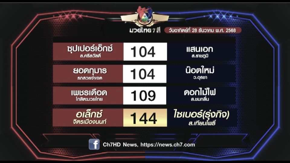 โปรแกรมมวยไทย 7 สี วันอาทิตย์ที่ 28 ธันวาคม 2568 ถ่ายทอดสดช่อง 7HD เวลา 14.30 น.