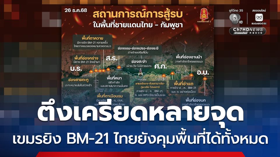เช้าวันนี้ 27 ธ.ค.2568 กองทัพภาคที่ 2 สรุปสถานการณ์ตามแนวชายแดนไทย–กัมพูชา วานนี้ ( 26 ธ.ค.68 ) ยังคงมีความตึงเครียดหลายจุด โดยเฉพาะในพื้นที่จังหวัดศรีสะเกษ ซึ่งเกิดการปะทะด้วยอาวุธยิงสนับสนุนอย่างต่อเนื่อง ขณะที่กองกำลังฝ่ายไทยยังสามารถควบคุมพื้นที่ยุทธศาสตร์สำคัญไว้ได้