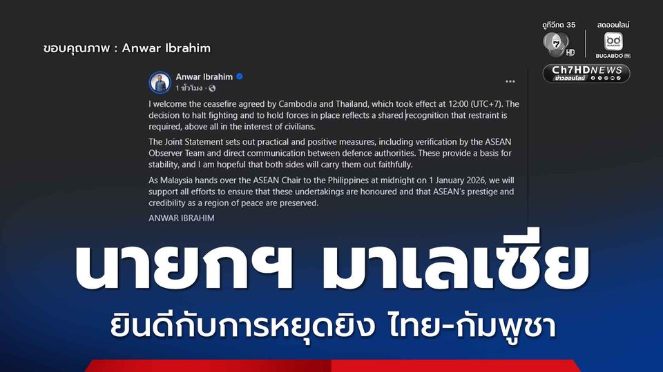 วันนี้ (27 ธ.ค. 68) อันวาร์ อิบราฮิม นายกรัฐมนตรีมาเลเซียยินดีกับการตกลงหยุดยิงระหว่างกัมพูชาและไทย ซึ่งมีผลบังคับใช้ตั้งแต่เวลา 12.00 น.