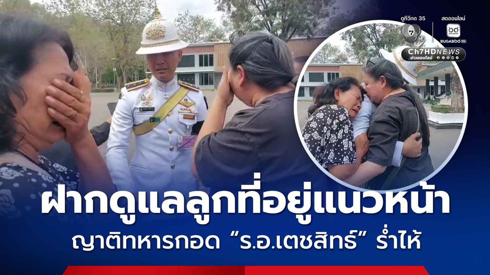 ญาติทหารที่อยู่แนวหน้ากอด ร.อ.เตชสิทธ์ ฤทธิ์จรูญ ผู้บังคับกองร้อยยานเกราะที่ 2 สมรภูมิหนองจาน ร้องไห้ ฝากดูแลลูกชายที่กำลังปฏิบัติหน้าที่อยู่ชายแดนให้กลับมาอย่างปลอดภัย